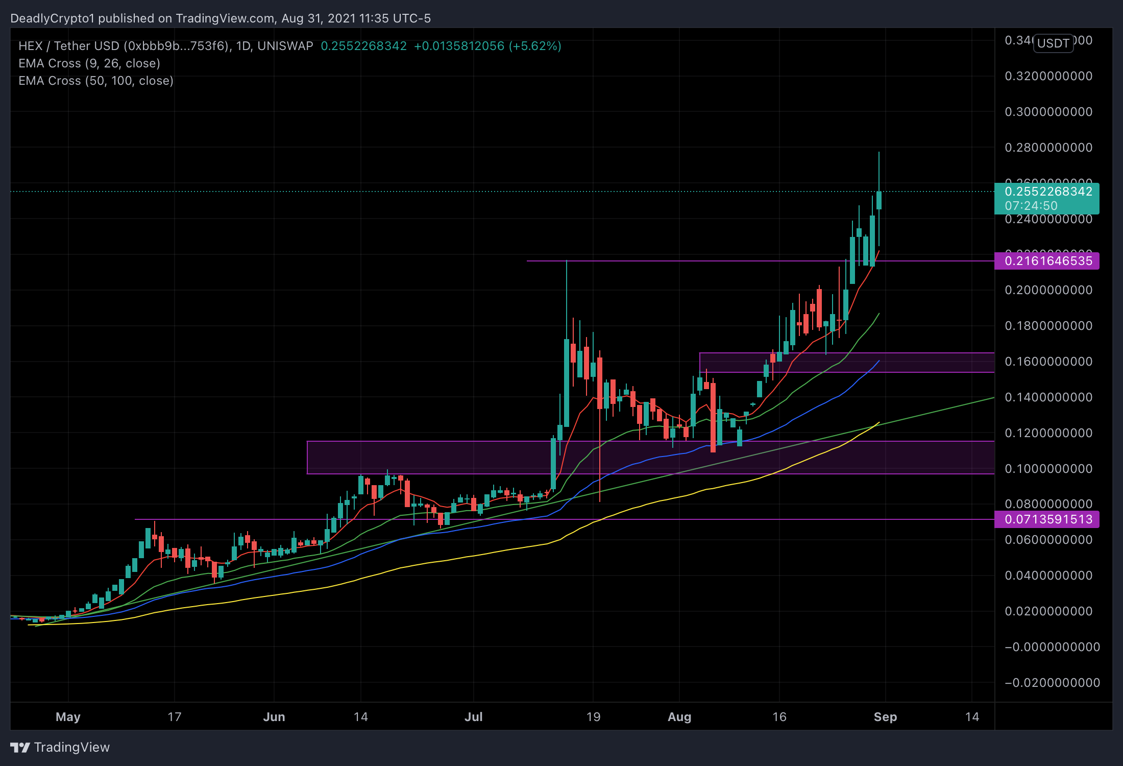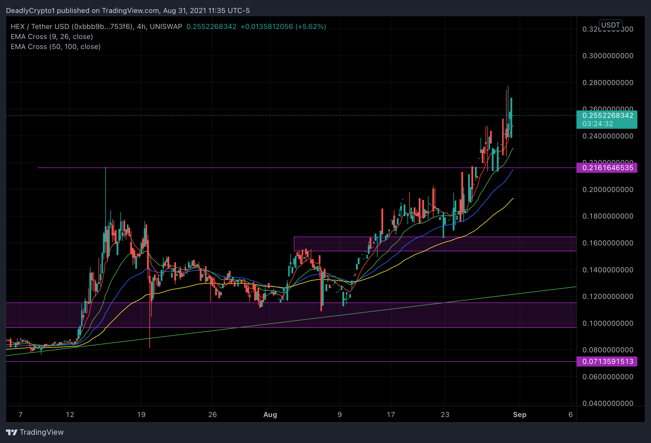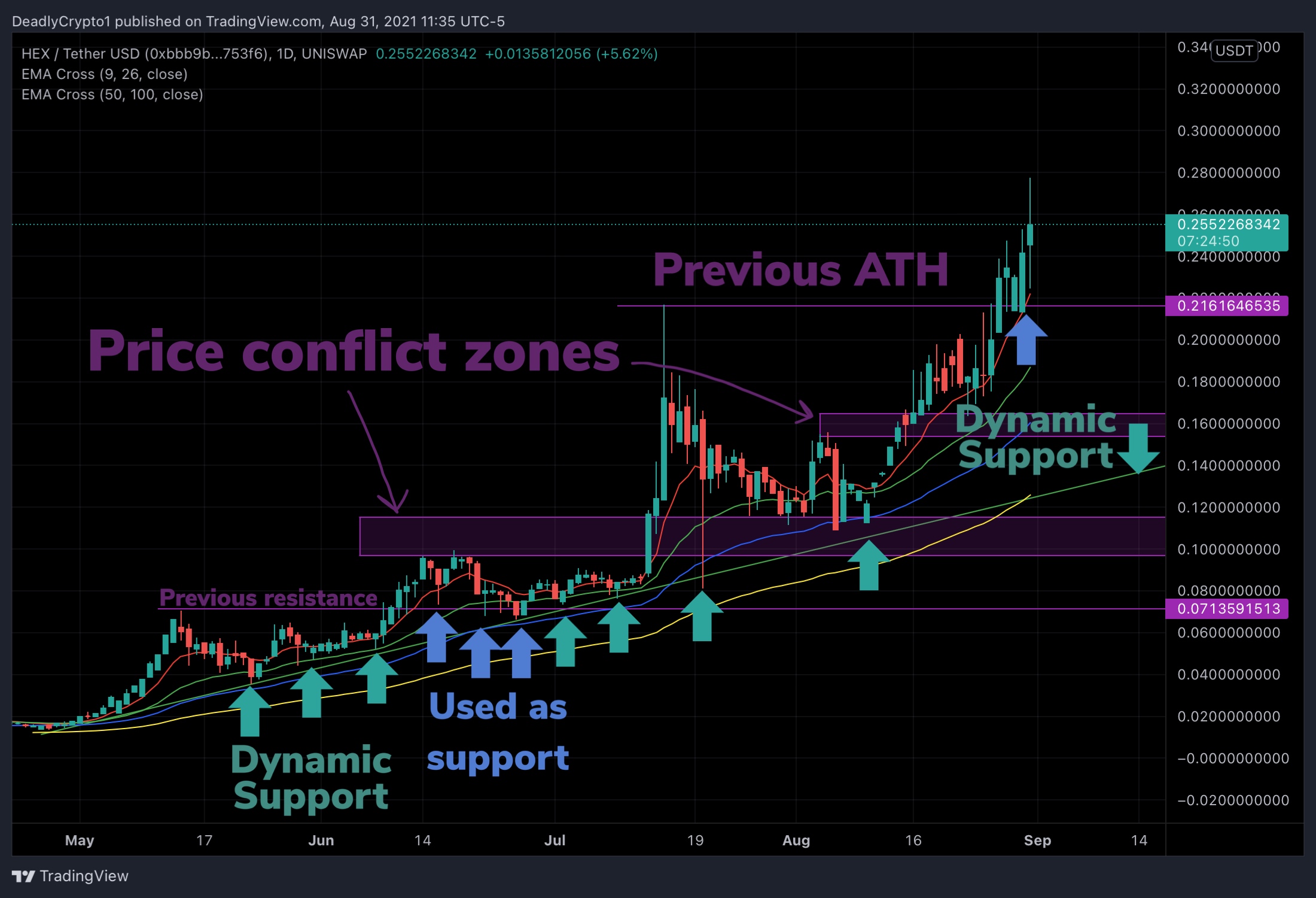 HEX is showing a valid uptrend as daily candles reach past a previous all time high. The current price action is far away from the dynamic support line, (green uptrend line). Since price has shot through the previous all time high resistance it may be respected now as a support. It is important to observe price action for a retrace to this level as if it is not sustained it could mean lower price action is on the way. Here is what that idea looks like with some explanations.
