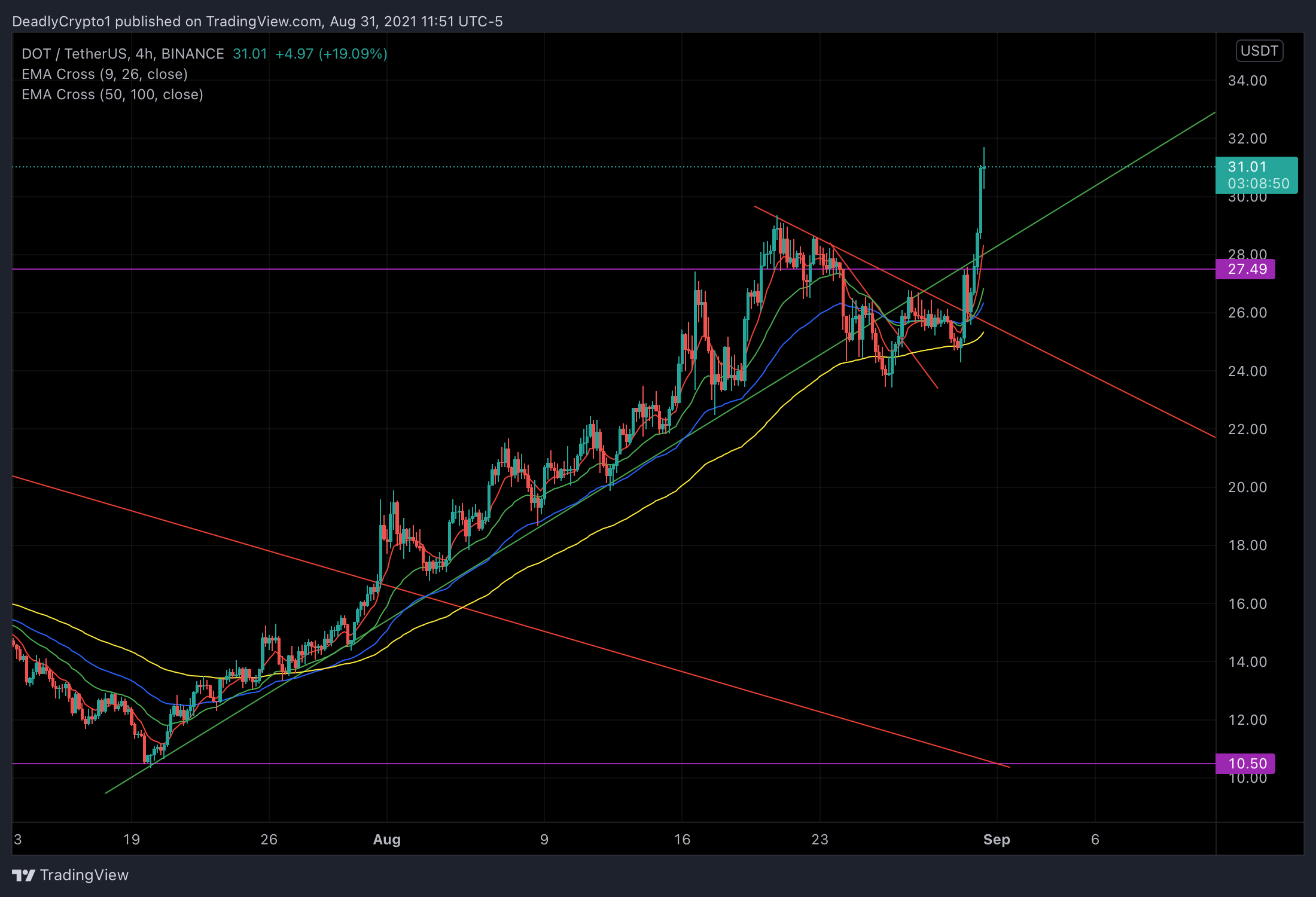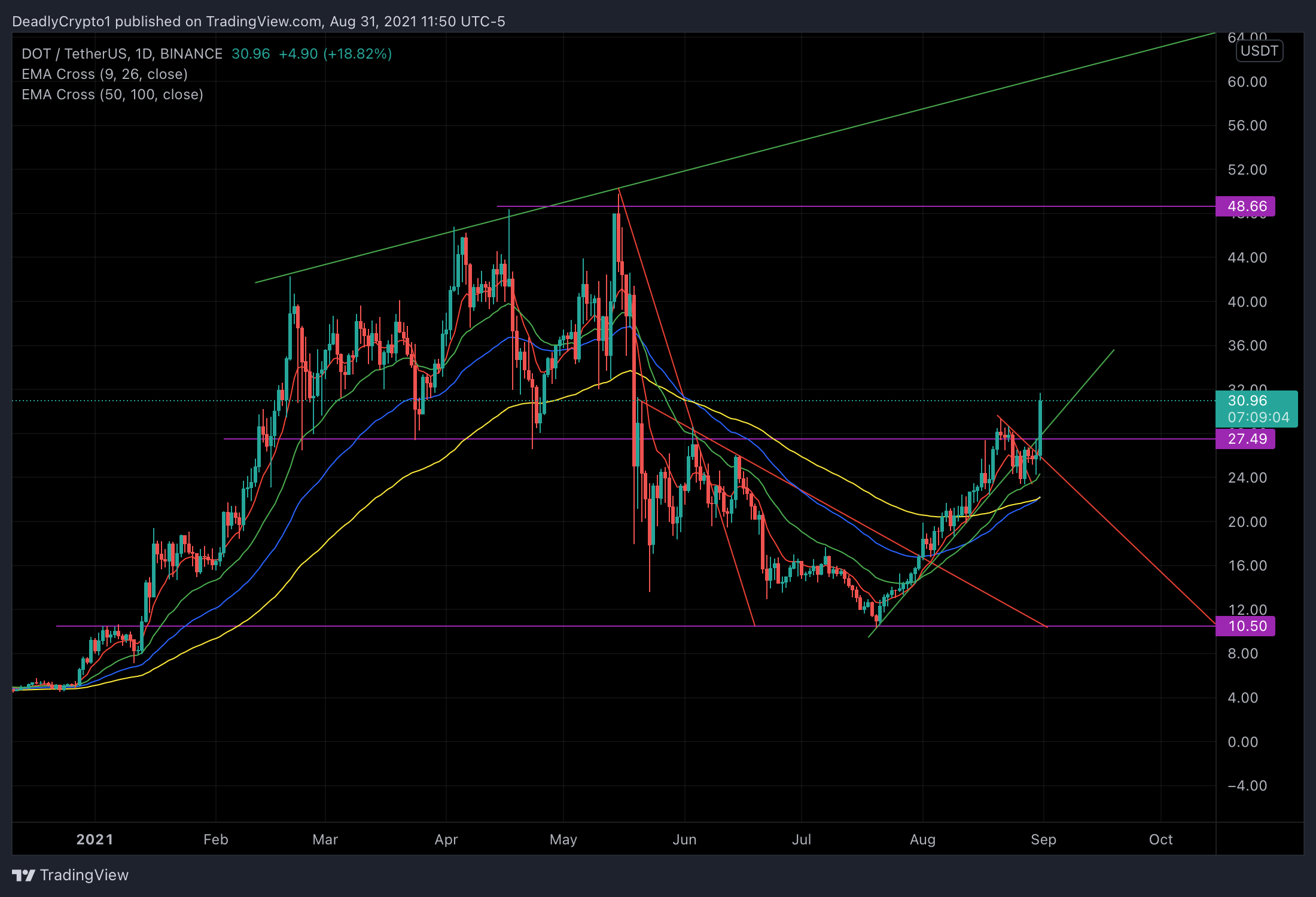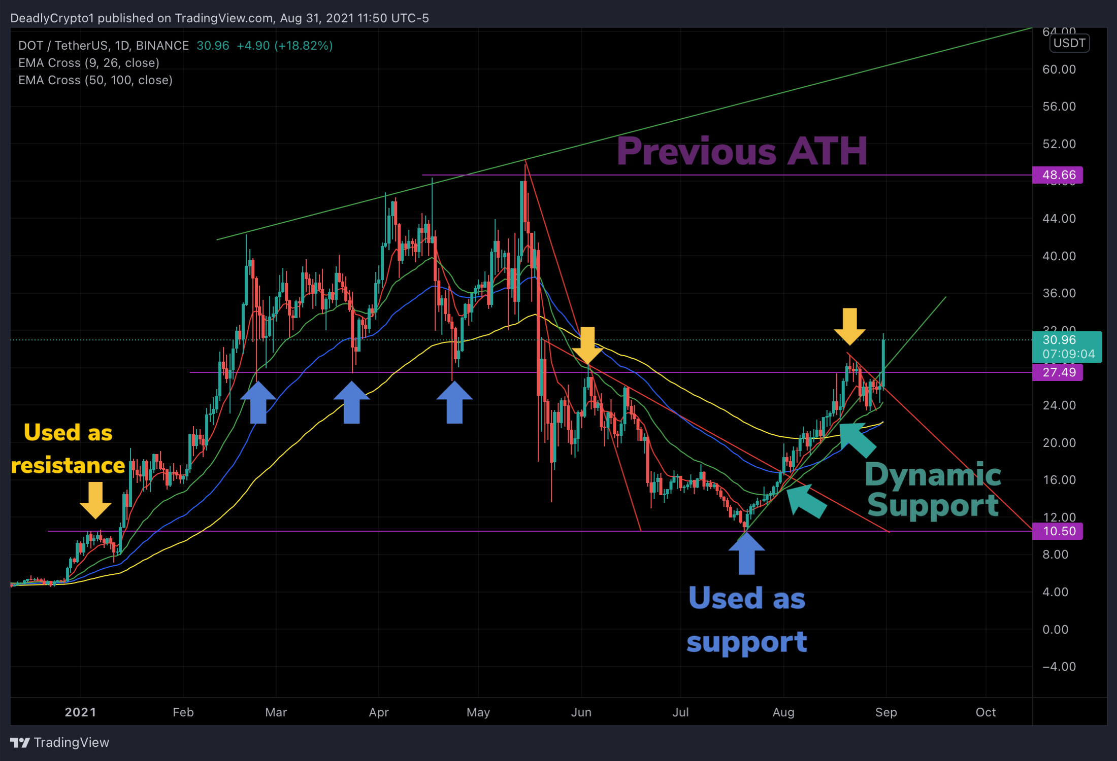 We can observe on the daily time frame of DOT that price is currently shooting through a wedged price formation. There was a purple line near current price action representing resistance as it had previously been used as support in the past. Price has technically re-entered a valid uptrend indicated by the upward sloping green trend line.