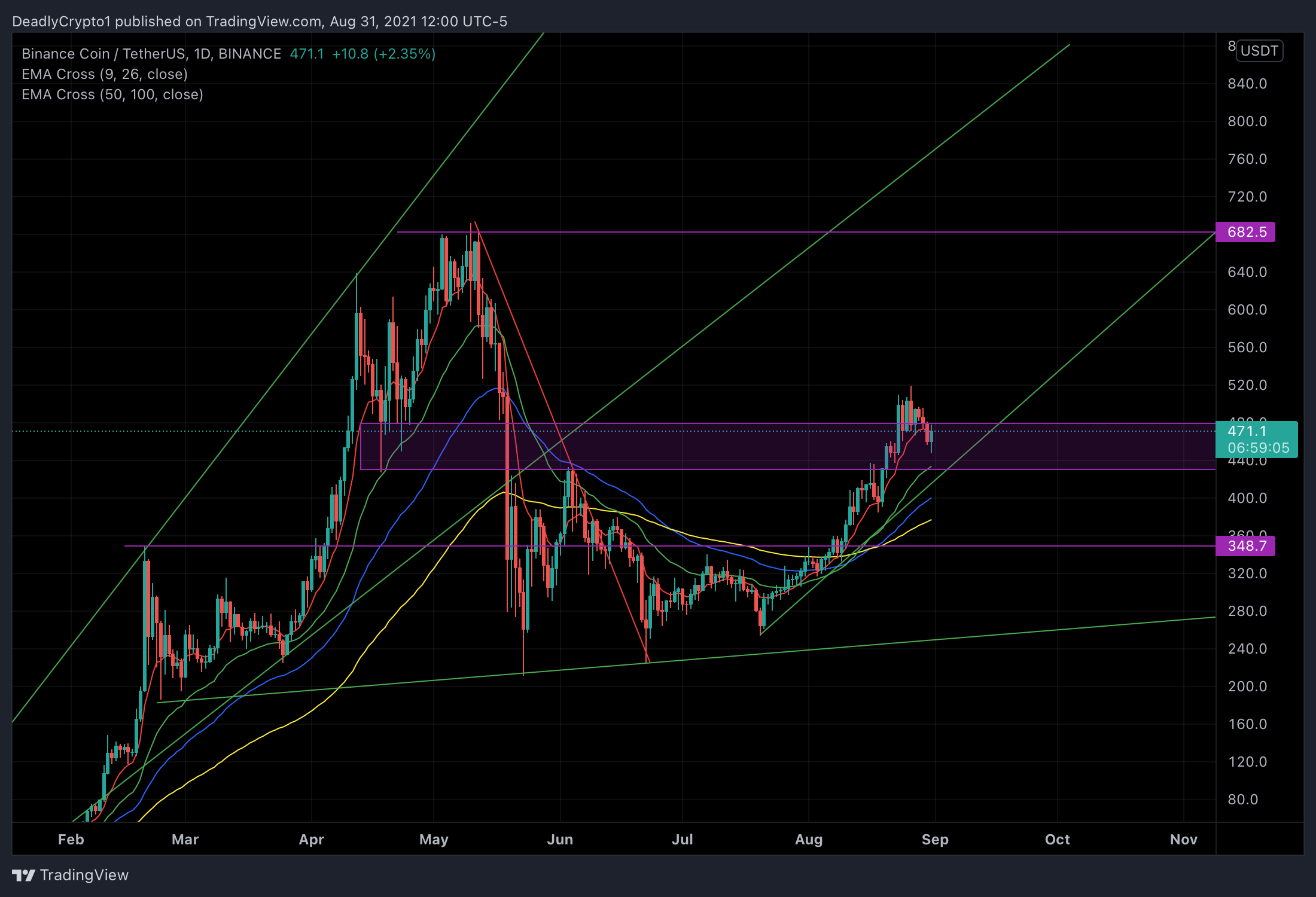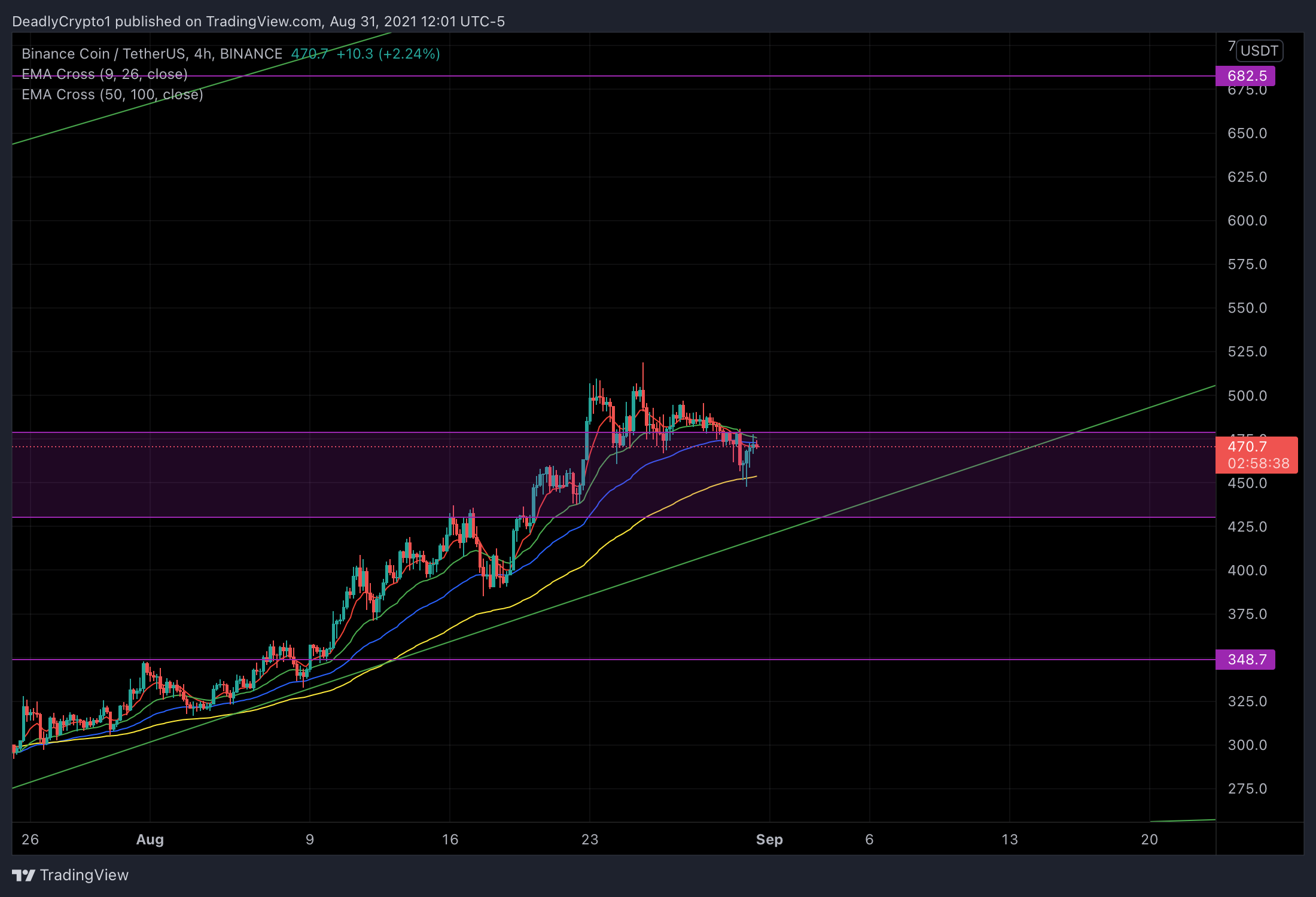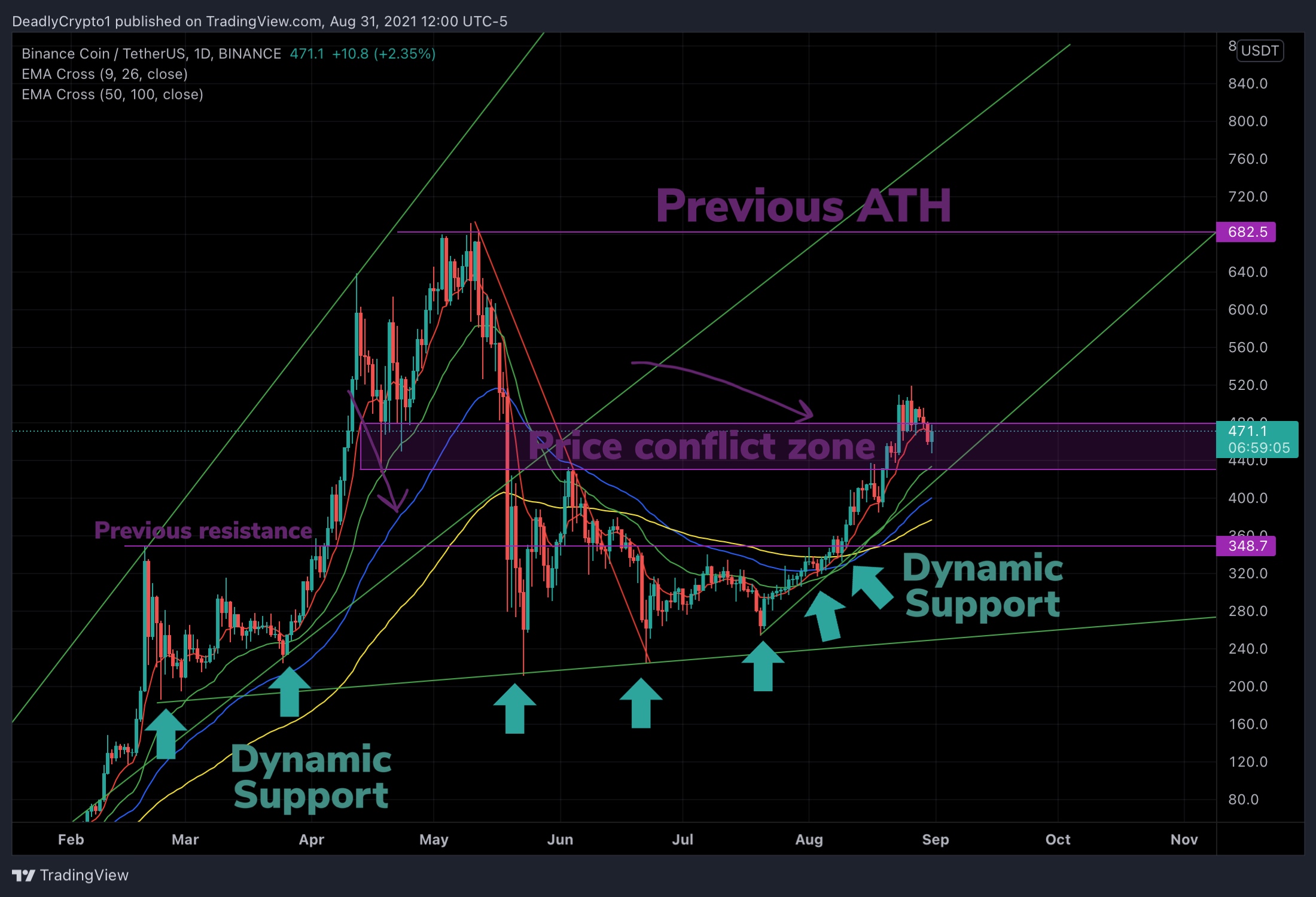 This coin is showing a different market structure than most other coins. Many coins have found obvious areas of support/resistance yet BNB is showing ranging price conflictions and dynamic support lines throughout. There is a technical valid uptrend indicated by the upward sloping green line labeled dynamic support. There aren’t too many indicators telling us that this should be shorted in the bigger picture.