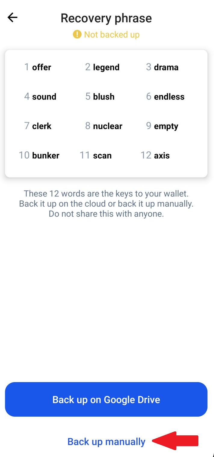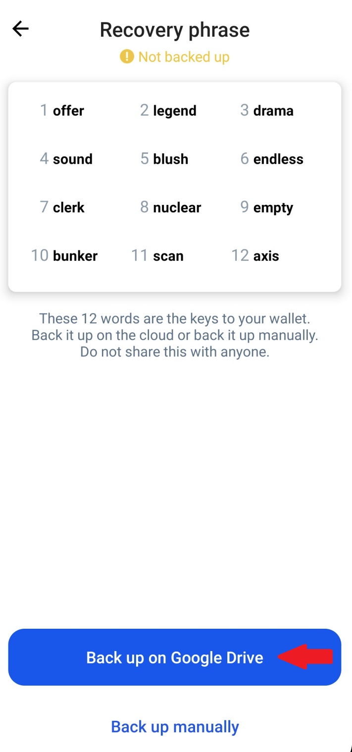 Note: Follow the instructions to back up your wallet manually because using Google Drive to backup your wallet makes your crypto wallet vulnerable to being hacked.