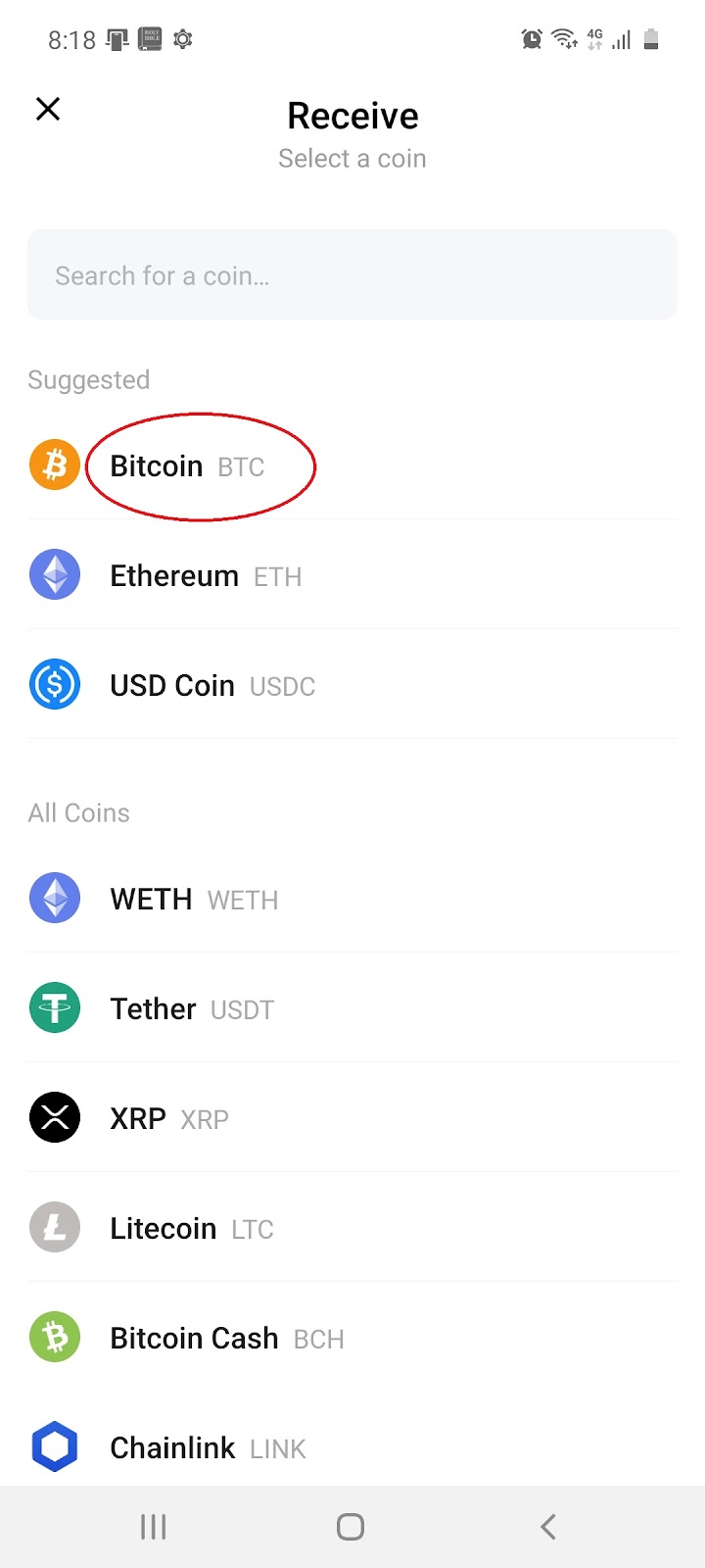 4.2 Choose from the pop up which cryptocurrency you would like to receive (e.g. Bitcoin):