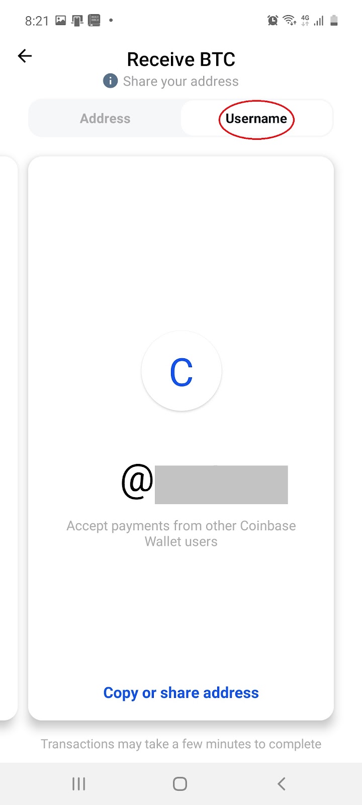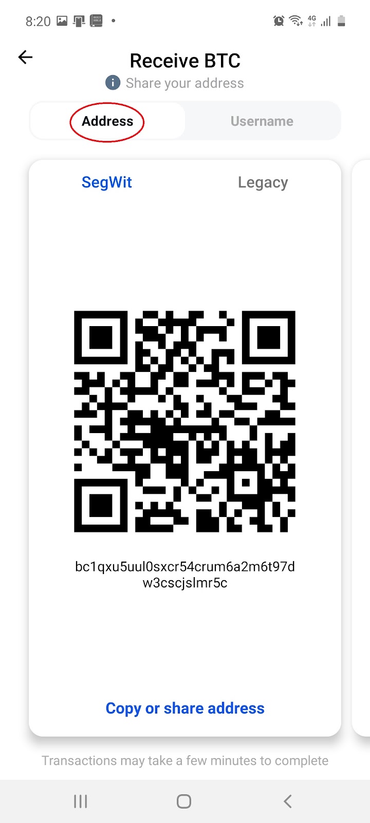 4.3 Choose to receive BTC using your ‘Address’ or ‘@Username’: