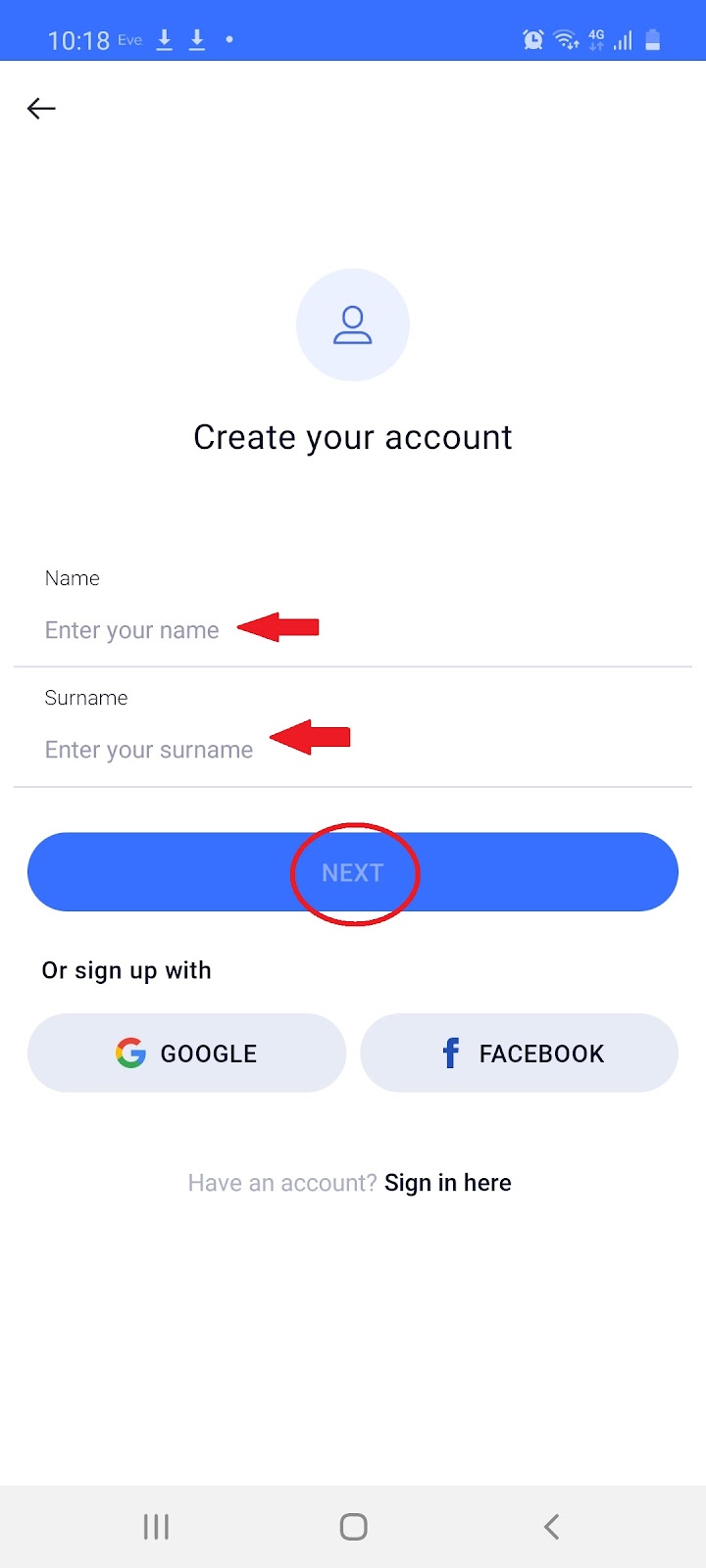 1.2 Using the mobile app, select ‘Sign up here’ and enter your name, surname and ‘Next’: