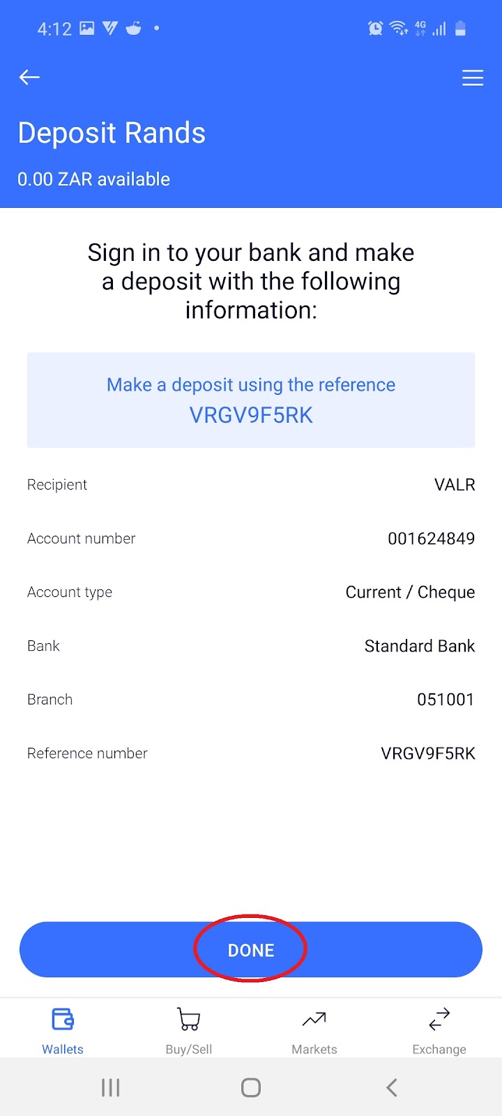 2.4 Follow the instructions on where to make a deposit as below and select ‘Done’: