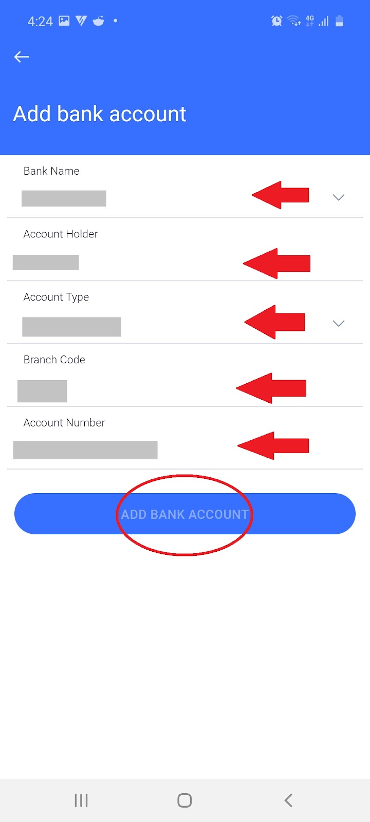 2.5.4 Fill in your banking details and ‘Add Bank Account’: