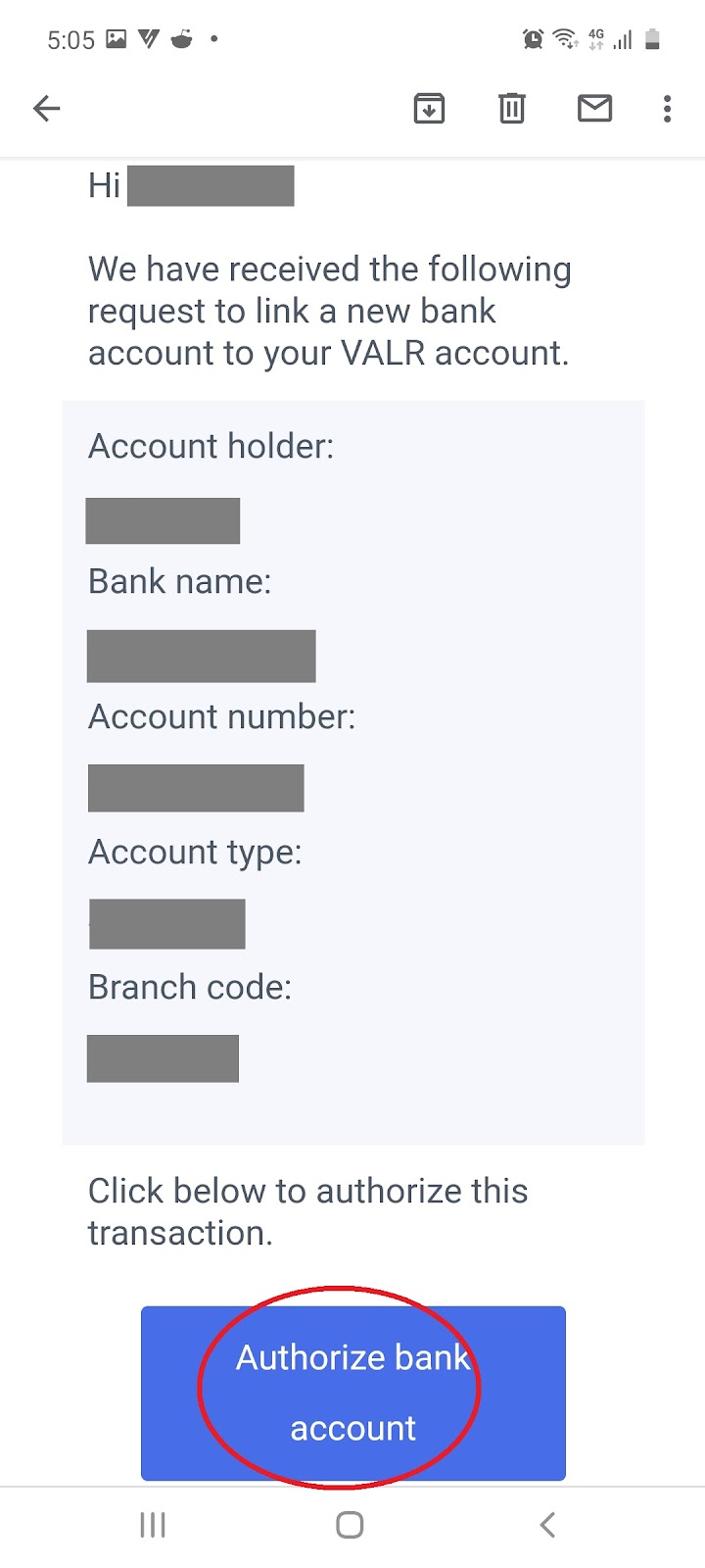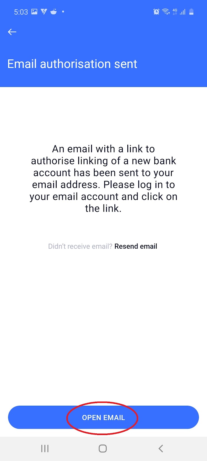 2.5.5 Select ‘Open Email’ and then click ‘Authorize bank account’ in the email sent to you: