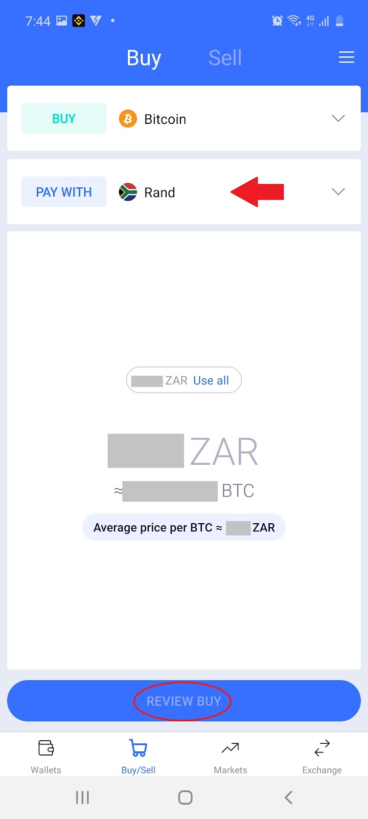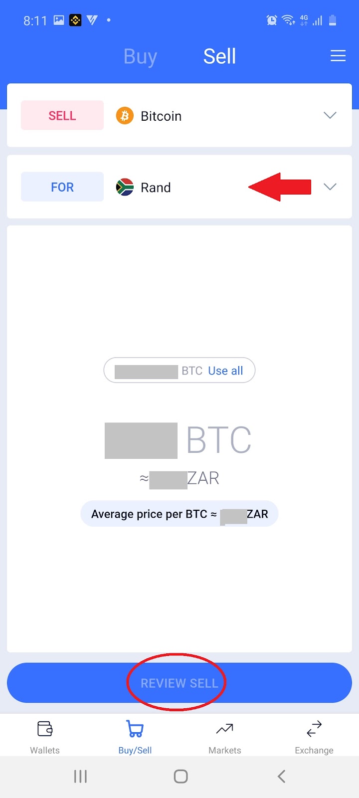 4.2 Select which currency to sell for your Bitcoin and select ‘Review Sell’:
