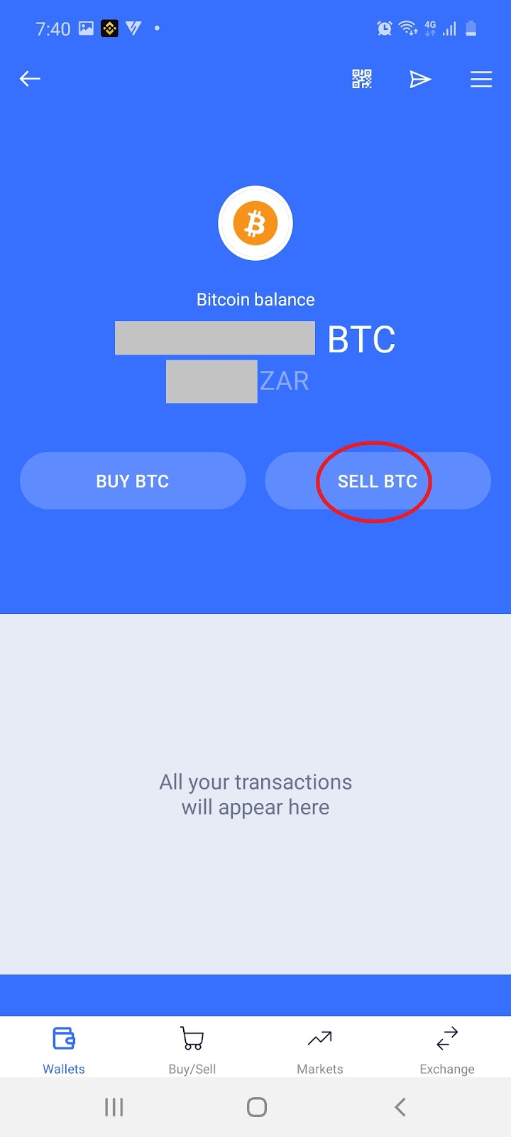 4.1 On your wallets page select to sell Bitcoin and then select ‘Sell BTC’: