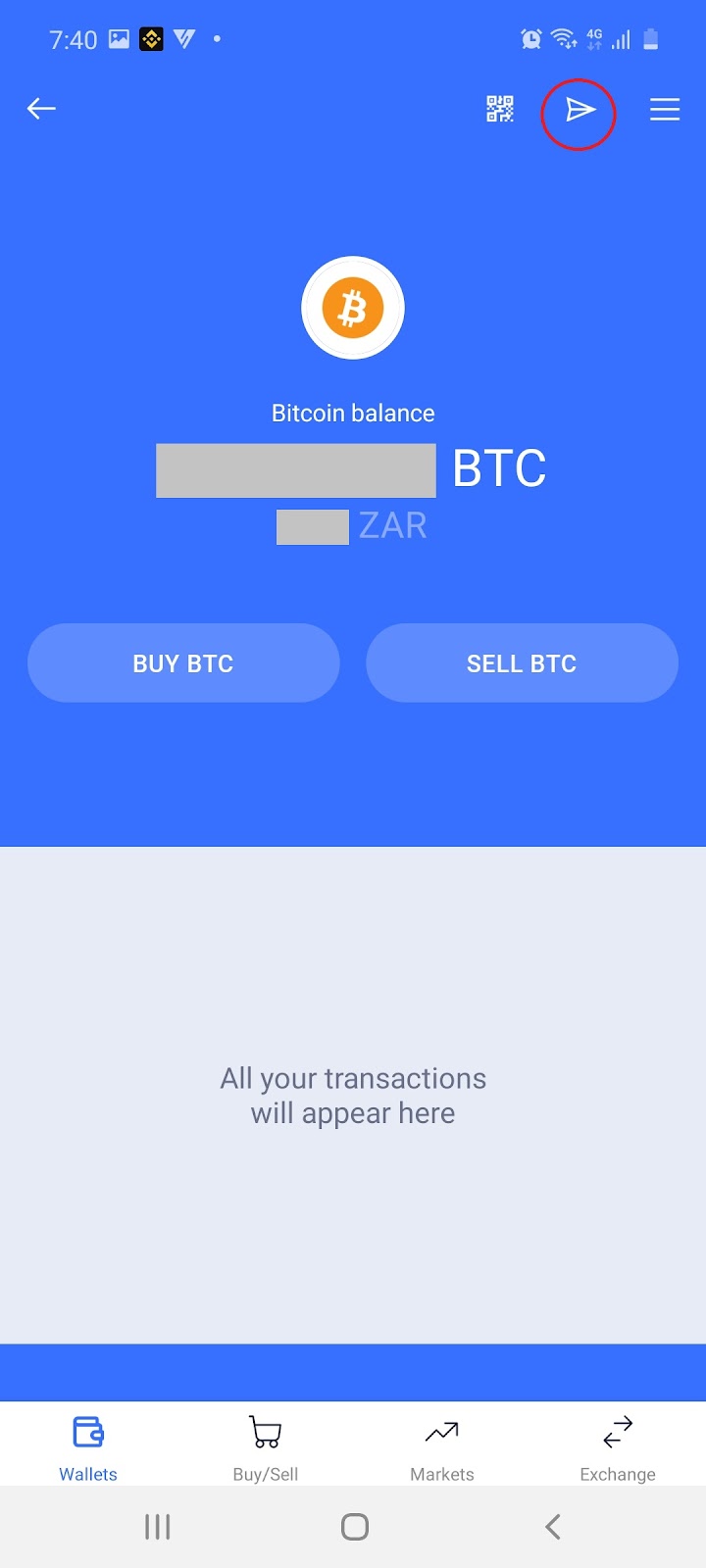 5.1 On your wallets page select to send Bitcoin and then select the ‘Send’ icon: