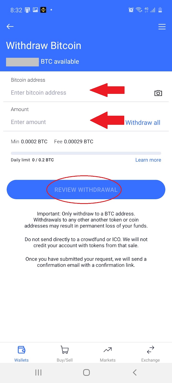 5.2 Fill in the ‘Bitcoin address’, ‘Amount’ and select ‘Review Withdrawal’: