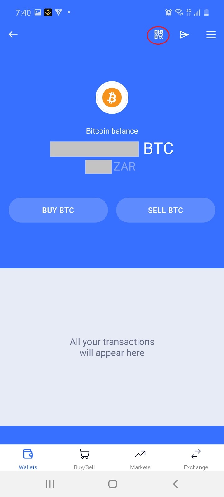 6.1 On your wallets page select to receive Bitcoin and then select the ‘QR code’ icon: