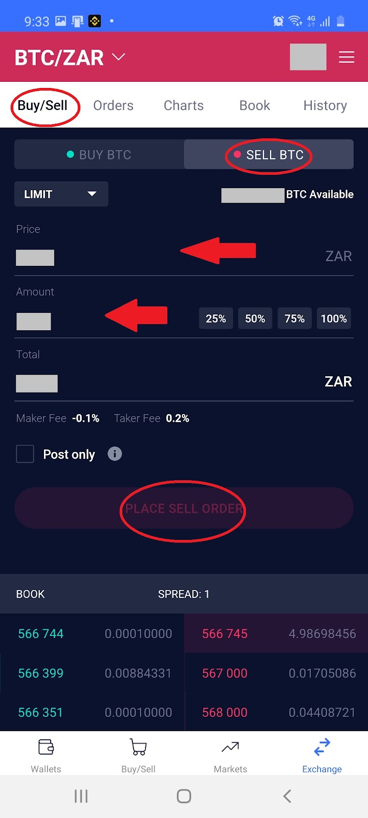 7.4 To sell select ‘Buy/Sell’, then ‘Sell BTC’, enter price, amount and ‘Place Sell Order’: