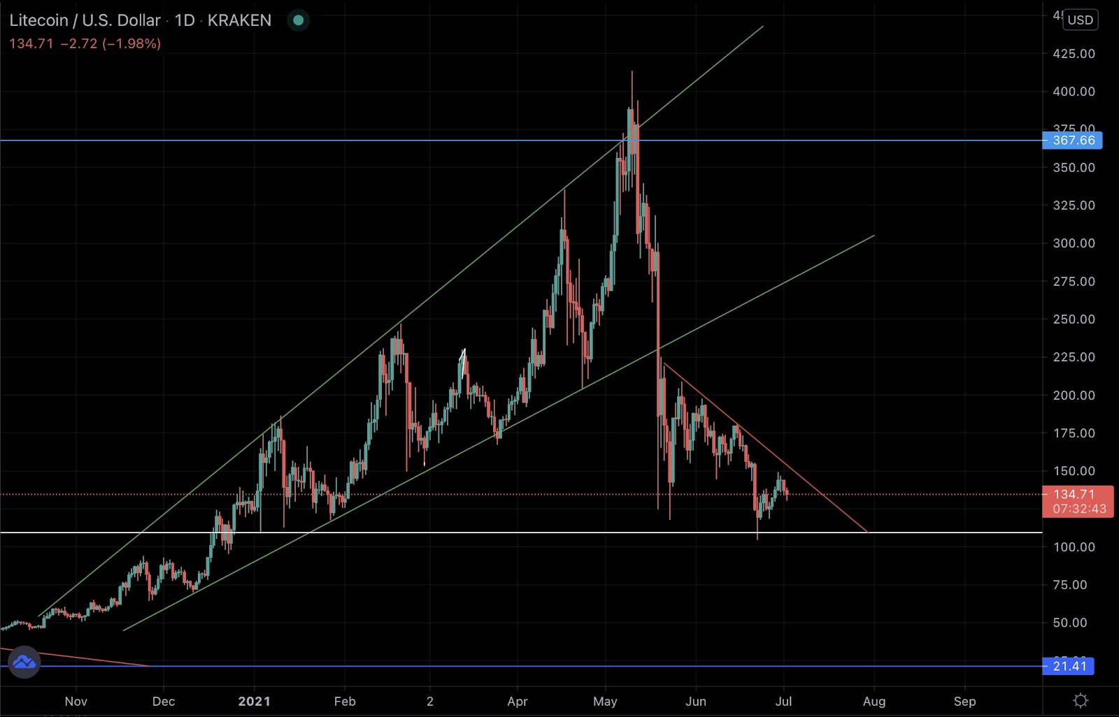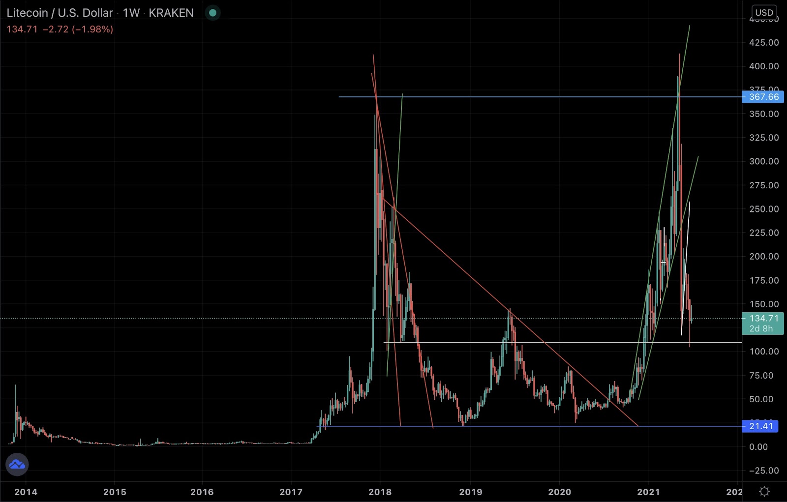Looking through the price action history of Litecoin there are observable peaks and bottoms. Popular cryptocurrency exchange Kraken has recorded price data since late 2013. We will be cross referencing Krakens records to report on Litecoin’s technicals.