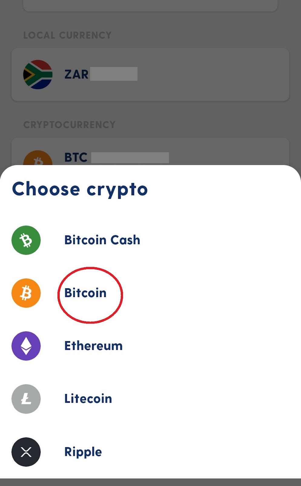 5.2 Choose from the pop up which cryptocurrency you would like to send (e.g. Bitcoin):
