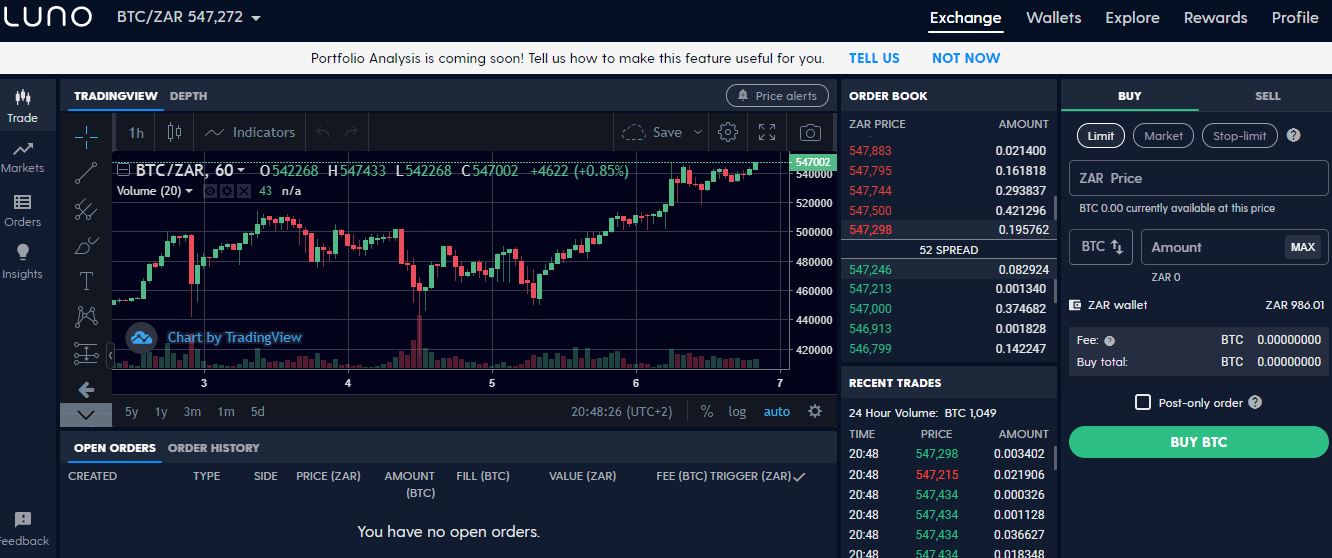 The Luno Exchange is simply a platform that connects buyers with sellers. You're able to place limit orders. This allows you to select a price at which you want to buy your crypto, and this order stays pending until the market reaches your price.