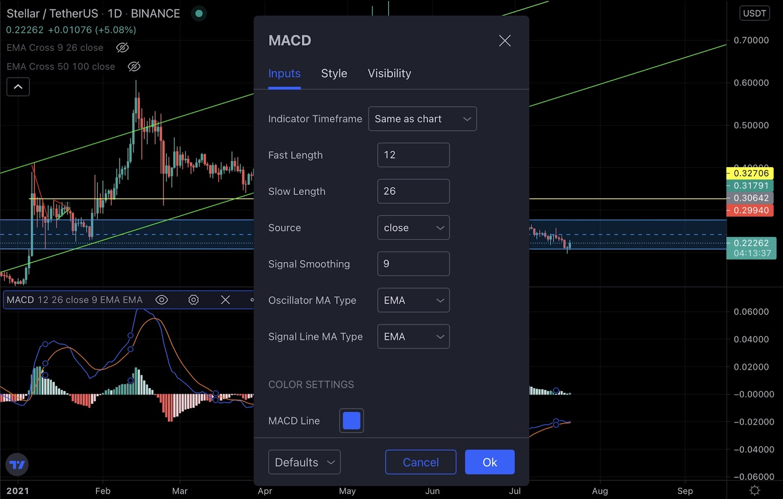 The technology available at the time did not allow most users to view or generate information on smaller time frames. Therefore the fast length uses a value of 12 as this would be two work weeks worth of information. The slow length uses a value of 26 which would be a work month worth of information. The fast length minus the slow length gives us our MACD line. The source dictates where the information will be calculated from. It is suggested to use candlestick closes as they are better confirmations. The signal smoothing having a value of 9 means that it uses one and a half work weeks data. It is used to determine a change in momentum when crossing over the MACD line. The Oscillator MA type and Signal line MA type inputs allow a trader to select exponential moving averages (EMA) or simple moving averages (SMA). We will not get to into style or visibility too heavily as they are more for user preference and do not affect the indicators interpretability.