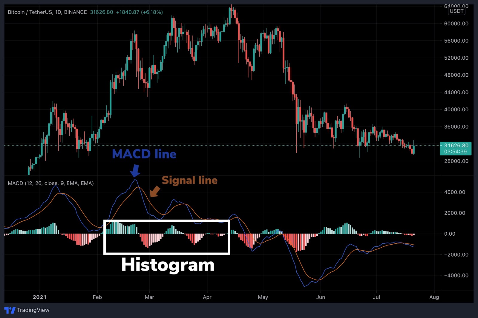 Now that we understand the value inputs for the MACD indicator lets take a look at how to read them. The MACD signal line is usually displayed in blue while the signal line is usually displayed in orange. We also have the histogram. This is also the difference of the MACD and signal line except displayed in bar format. The height of the bars show the strength of the movements.