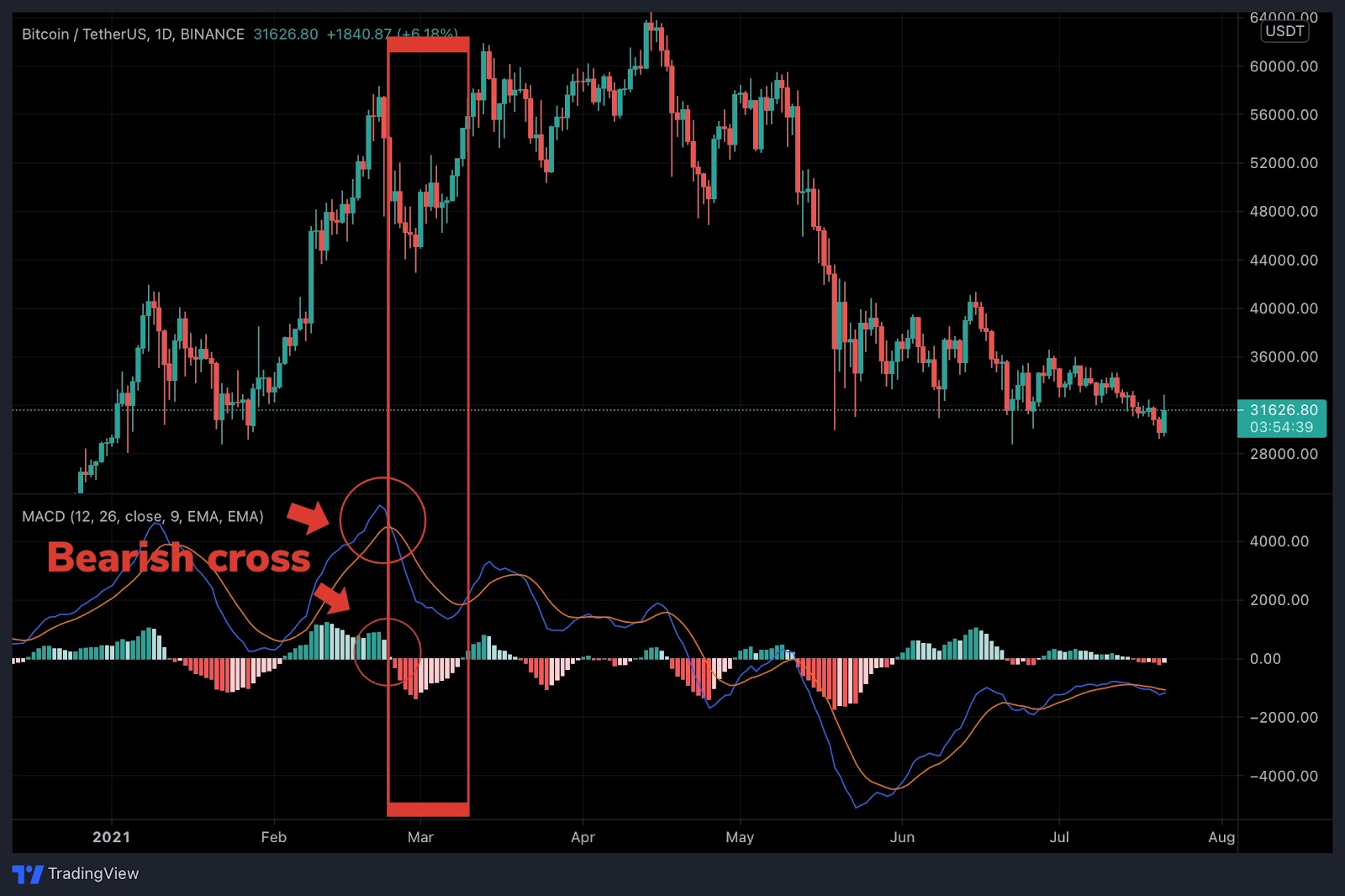 A bearish crossover occurrence is a good sign to look for a short opportunity. It is important to note the price ranges being traded when using the MACD to determine entries and exits.