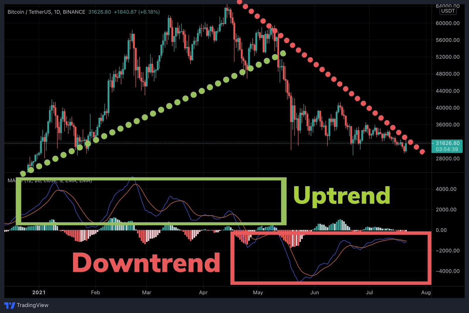 Finally, when the MACD and signal lines are trending above the histogram median, the larger picture is considered an uptrend. On the flip side, when the MACD and signal lines are trending below the histogram median, the larger trend is considered a downtrend. (Example below)