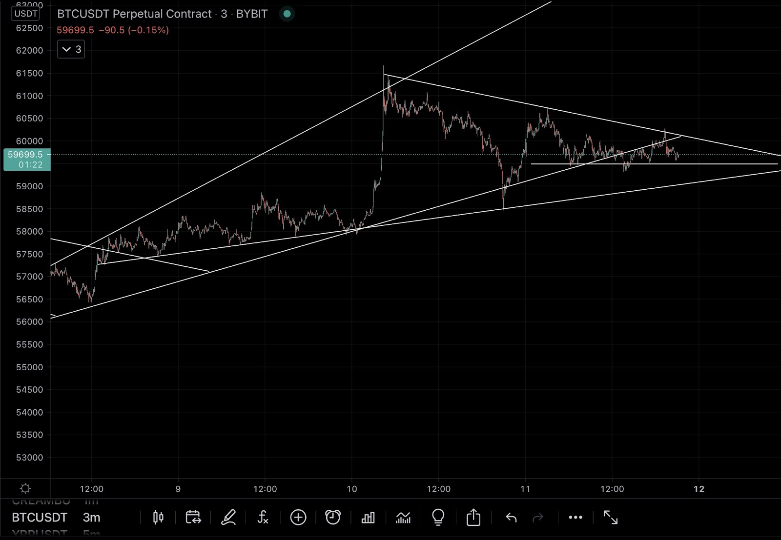 In this photo we can see BTC/USDT forming a wedge on an uptrend channel . We have a larger ascending channel that seems to have been breached. However, candlesticks find support along a second lower dynamic support line. We find that as the wedge draws closer to an outbreak there is a short term support as well forming a second wedge.