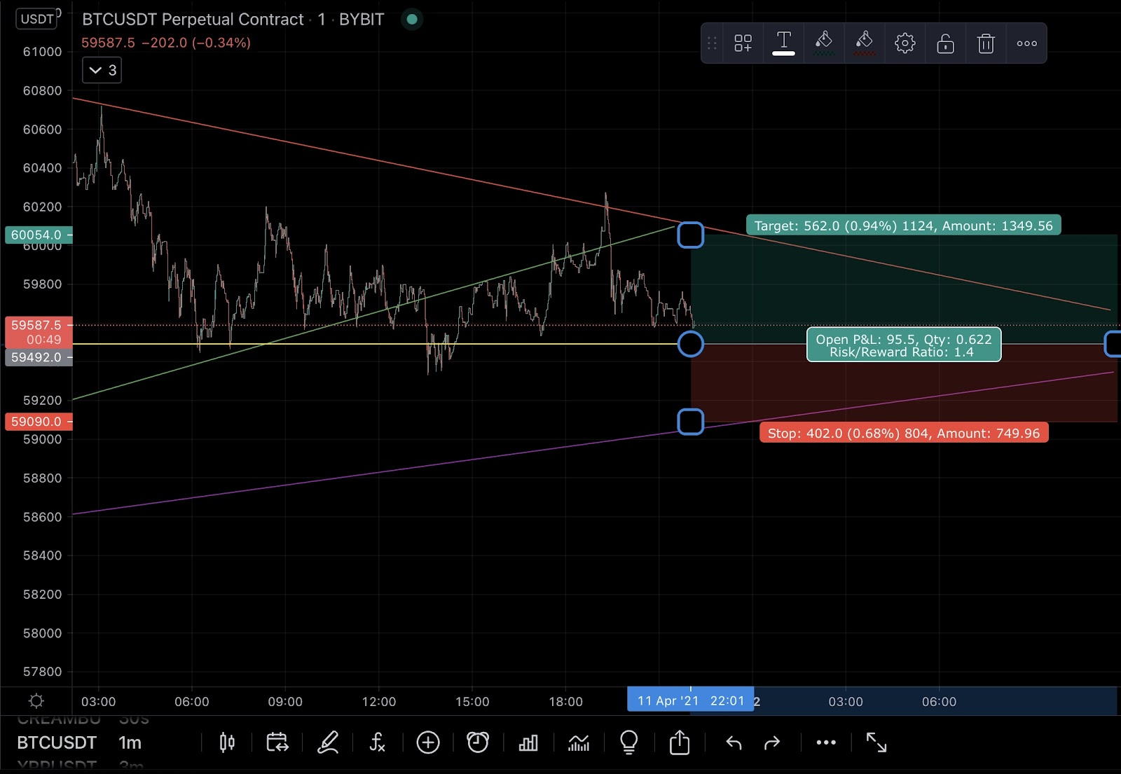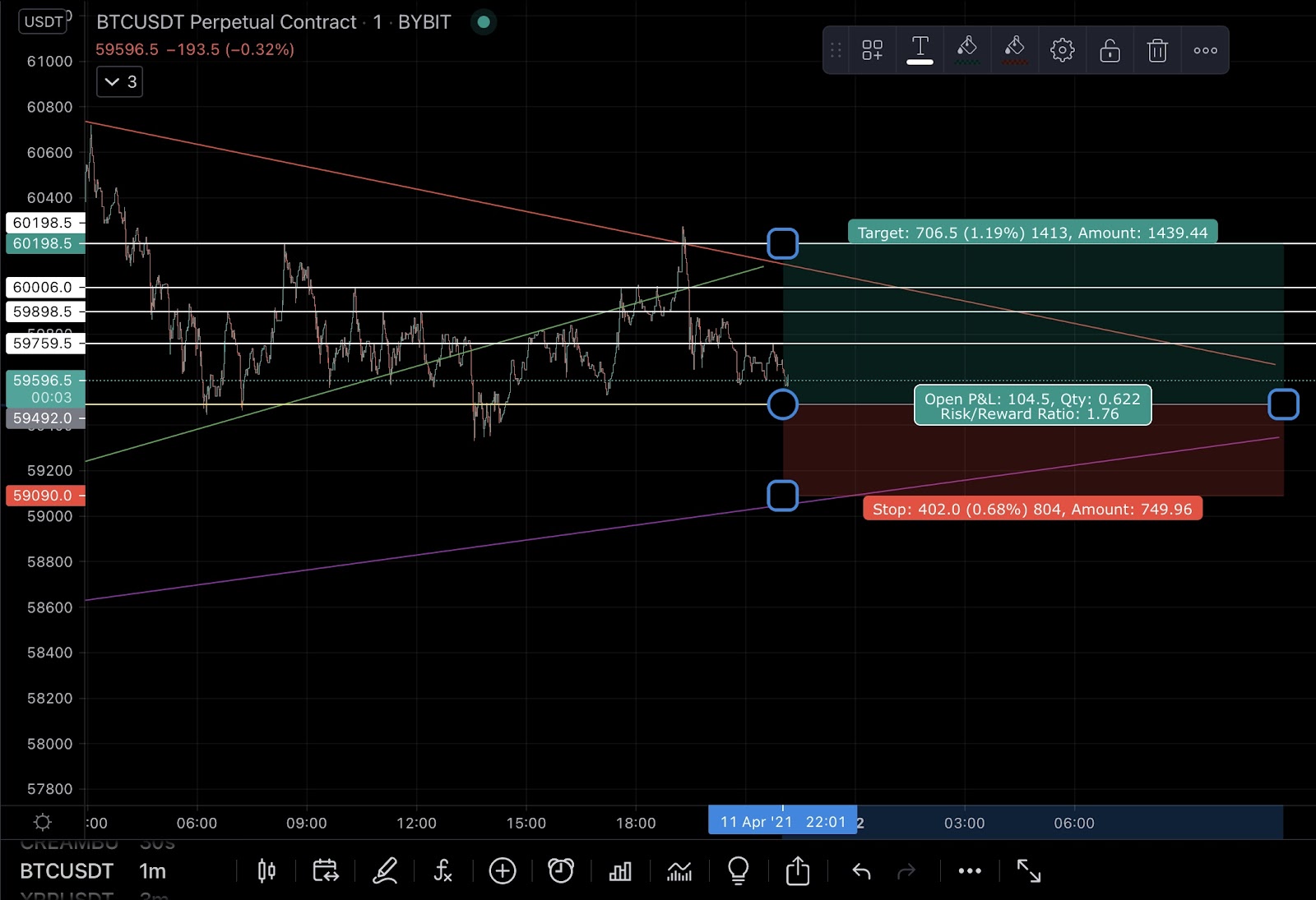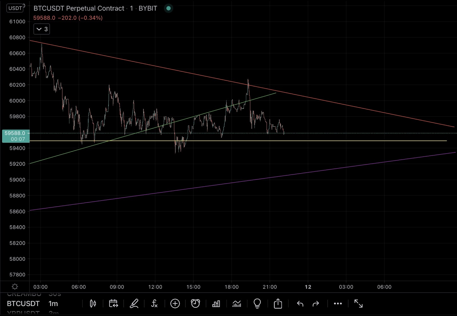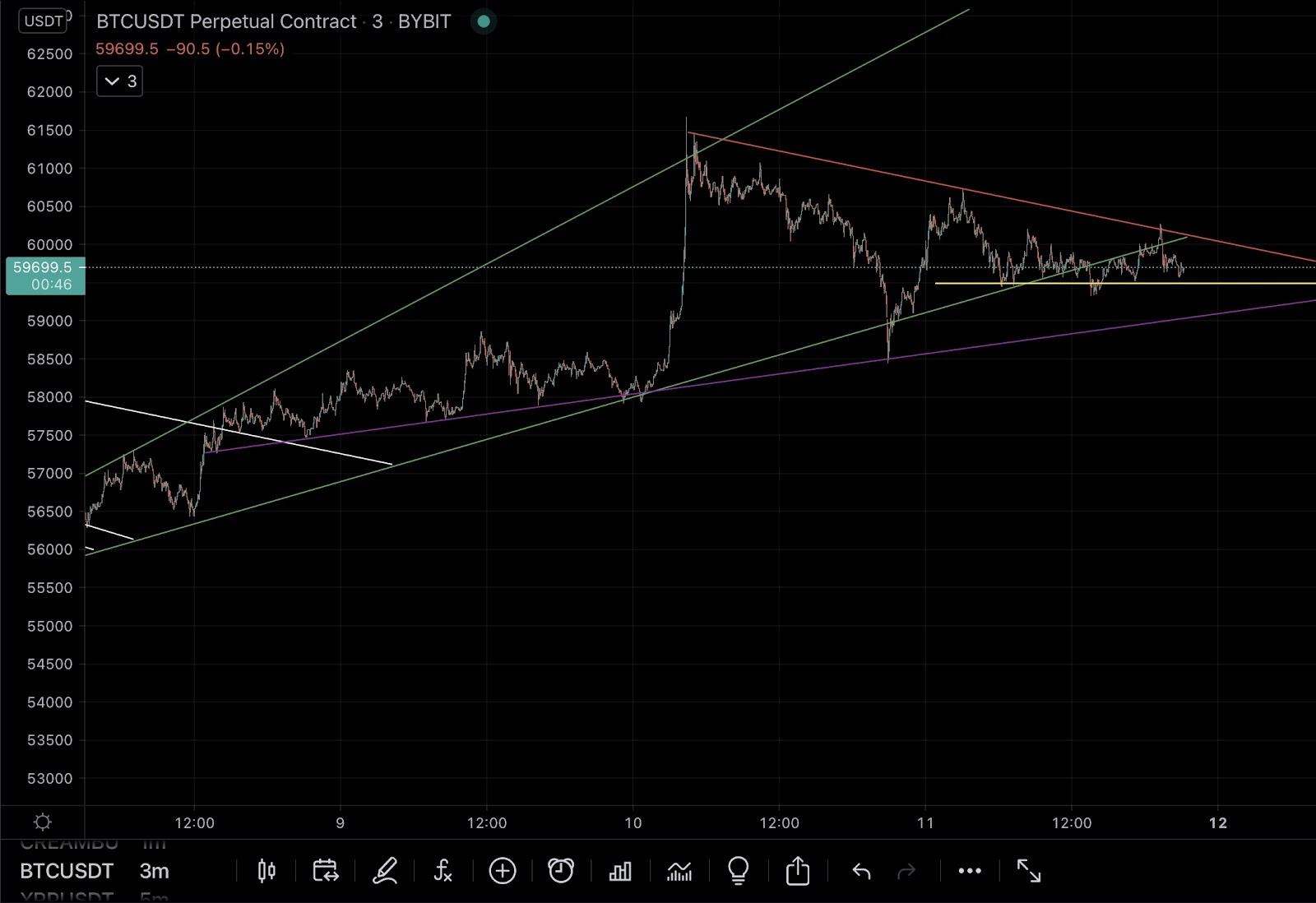 Here is the same photo now with the ascending wedge in green, the dynamic support as purple, the wedge line as red and the short term support as yellow. These lines are respected multiple times so can be considered valid trend lines. It is along these trend lines you would find the most optimal entries. You take long positions on the bottom of uptrend and downtrend lines. You take short positions along the top of uptrend or downtrend lines.