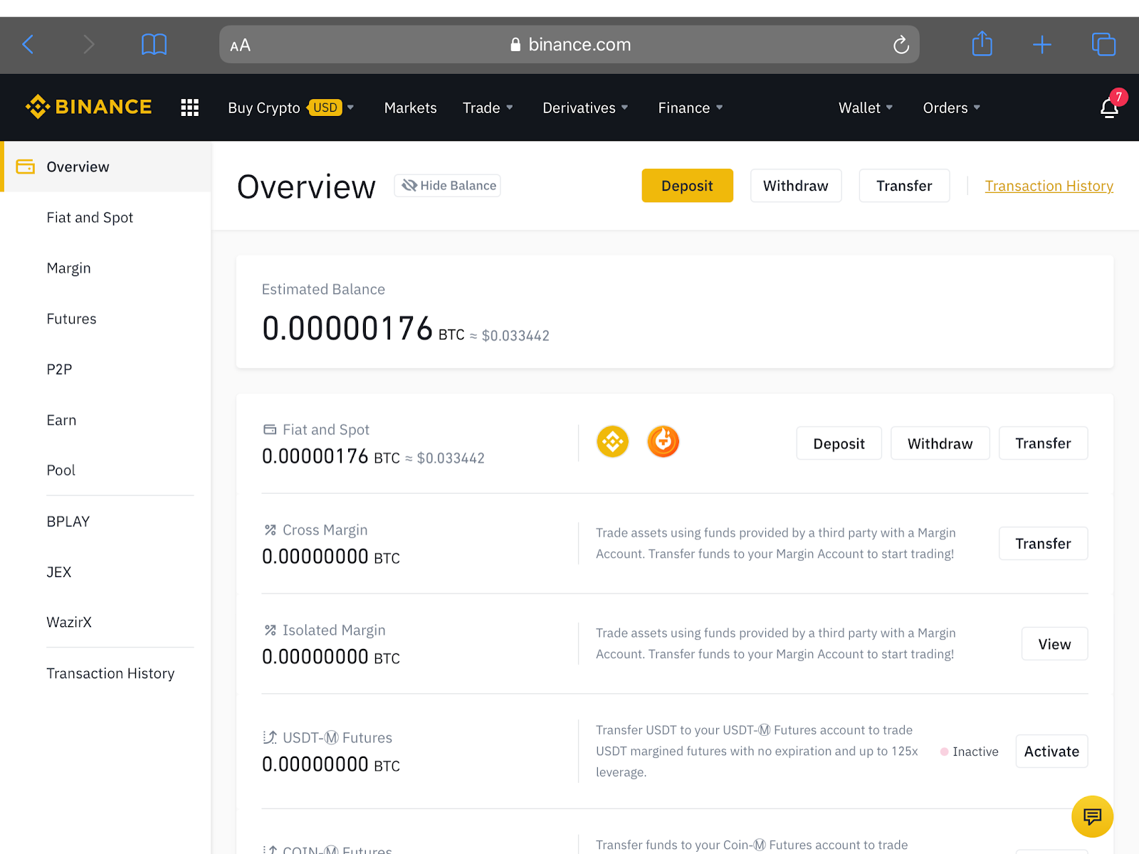 From the “Overview” screen, you can select “Deposit” to fund your account, “Withdraw” to extract funds from your account, or “Transfer” to change funds from your “Spot” wallet to your “Margin” or “Futures” wallets.